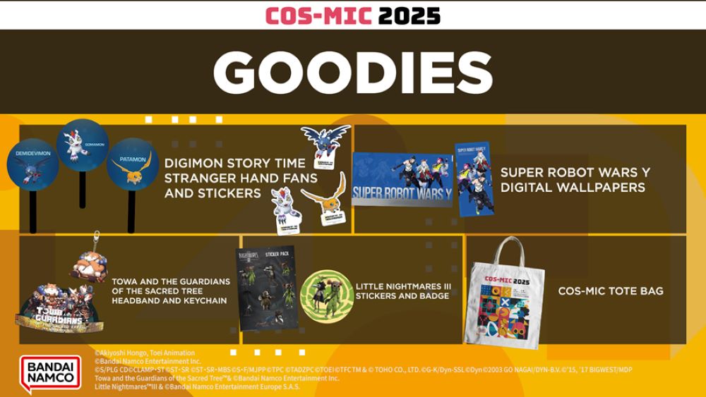 Bandai Namco Leisure Asia is providing a variety of unique giveaways at its sales space. Guests can decide up a free tote bag just by stopping by, whereas those that take part in on-site actions or check out recreation demos can earn restricted goodies resembling Digimon Story Time Stranger hand followers, Little Nightmares III badges, and sticker sheets. All gadgets can be found on a first-come, first-served foundation whereas shares final.