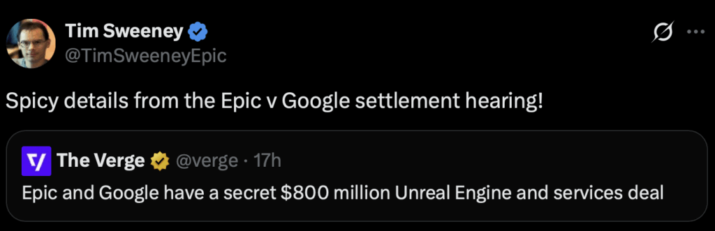 Within the remaining phases of the Epic Video games v Google lawsuit particulars of a secret partnership between Epic Video games and Google have been revealed. The entire particulars of this partnership have come by way of this Verge article, which even Epic Video games CEO Tim Sweeney tweeted about: